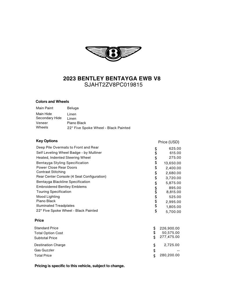 2023 Bentley Bentayga EWB V8 presented by Bentley Houston. Beluga with Linen and Beluga interior, this Bentayga features the Bentayga Blackline Specification, Bentayga Styling Specification, 22" Five-Spoke Wheels in Black Painted Finish with Self Leveling Wheel Badges - by Mulliner, Touring Specification, Rear Centre Console (4 Seat Configuration), Power Close Rear Doors, Mood Lighting, Veneer Trim in Piano Black, Illuminated Treadplates, Heated & Indented Steering Wheel, Contrast Stitching, Embroidered Bentley Emblems to all Seats, and Deep Pile Overmats to Front and Rear.This vehicle has already received our premium Paint Correction and Ceramic Coating treatment - an exclusive package professionally applied and included with your purchase.About Post Oak Motor Cars:Post Oak Motor Cars, a Fertitta Automotive Company, proudly represents Bentley, Rolls-Royce Motor Cars Houston, Bugatti, Karma, Lotus, Zenvo, Brabus, Hennessey, and Vintage Modern. Located in the prestigious Post Oak Complex in Uptown Houston, our flagship showroom offers an immersive luxury experience - surrounded by fine dining, designer fashion, luxury spa, and elegant accommodations. We also welcome you to our Lotus of The Woodlands showroom, located at 1501 Lake Robbins Drive. Our state-of-the-art service center and accessories boutique are supported by Certified Brand Representatives who can assist with:• Financing & lease options (including Crypto)• Enclosed nationwide transport• Trade-in valuations and appraisal services Whether you're browsing or ready to drive, our team is here to assist you. Visit us or call to schedule your personalized test drive today. Why Buy from Post Oak Motor Cars:• Texas #1 Selling Rolls-Royce Retailer• Texas #1 Selling Bentley Retailer• Texas' Only Authorized Retailer for Bugatti, Zenvo, and Vintage Modern